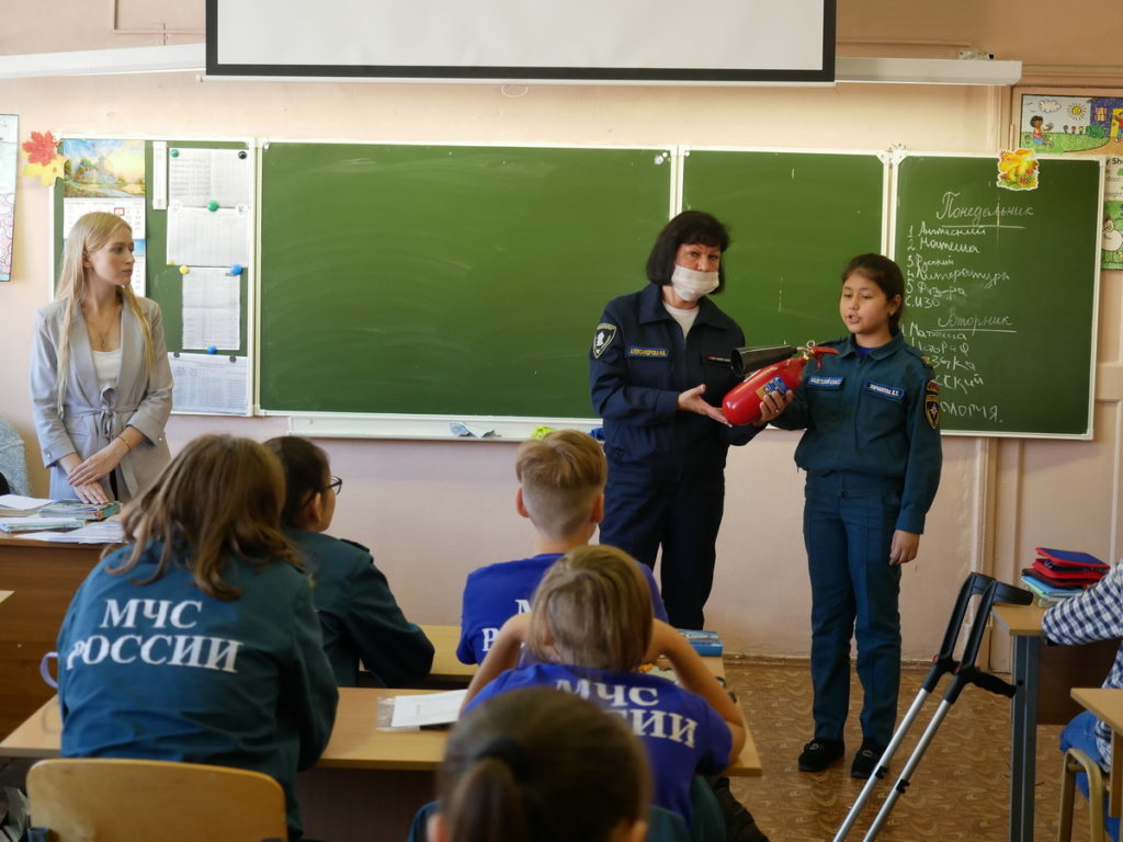 Во время урока дети узнали про первичные средства пожаротушения и сами рассказали из чего состоят огнетушители. Также успели проложить рукавную линию на время.