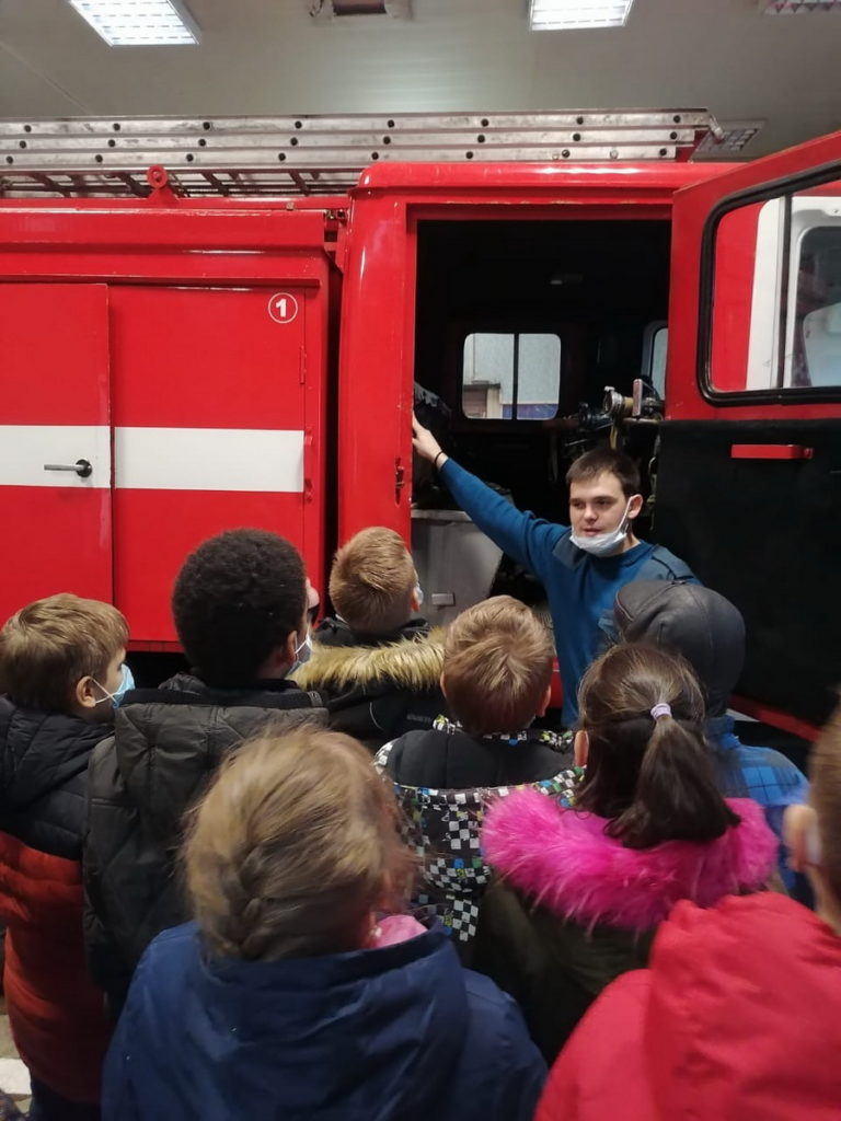 После посещения выставки, представитель боевого пожарного подразделения провел обширную экскурсию по помещениям пожарной части, с детальным показом всех элементов одежды пожарного, инструментов, используемых в работе, а также различных видов пожарной техники. Неотъемлемую часть экскурсии составляет беседа с детьми о правилах пожарной безопасности и действиях в случае пожара, а также об истории пожарного дела в Российской Федерации. Дети на все вопросы отвечали правильно и уверенно, что подтверждает высокий уровень профилактической направленности в образовательной школьной программе, и задавали множество интересующих вопросов.