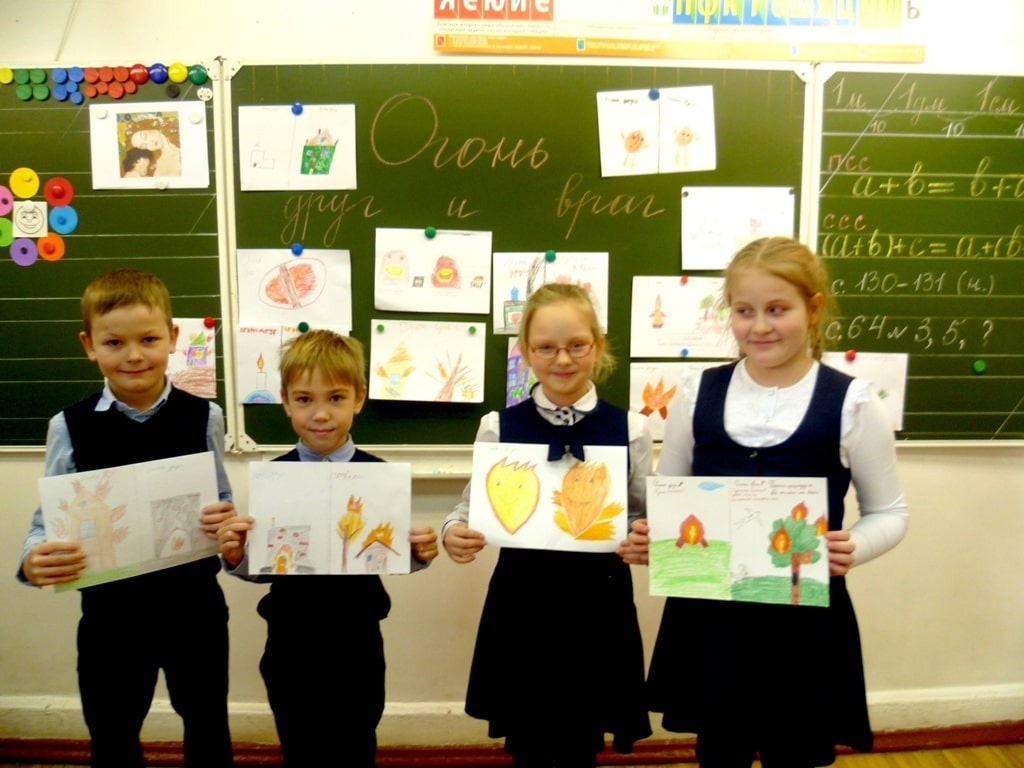 Ребятам продемонстрировали видеоролики по пожарной безопасности, раздали памятки: «Это должен знать каждый: Действия в случае возникновения пожара в школе»; «Памятка по противопожарной безопасности для школьников». На уроках дети познакомились с историей отношения человека к огню, обсудили вопросы, в каких случаях огонь выступает в качестве друга, когда он становится опасен, куда обращаться в случае возникновения пожара. Ученики 2-го и 3-го классов прочитали стихи С. Маршака «Очень-очень важные правила!», «Песенка спичек», «Пожар», «Рассказ о неизвестном герое», А. Усачева «Огонь», Е. Гладковой «Если огонь в доме». Опираясь на художественные произведения, ребята повторили основные правила пожарной безопасности для детей (правила обращения с огнем дома, в лесу). В заключительной части классного часа ребята рисовали рисунки, а учителя ещё раз напомнили им о безопасном использовании новогодних украшений и пиротехнических изделий в преддверии Нового года.