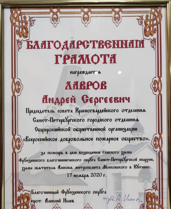 За своевременно оказанную помощь Красногвардейское отделение СПб ГО ВДПО получило благодарственную грамоту от настоятеля храма.