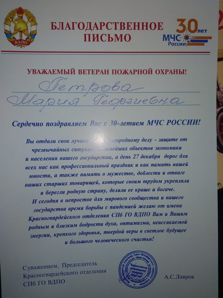 Ветераны, которые в том числе являются сотрудниками Красногвардейского отделения СПб ГО ВДПО были поздравлены лично коллективом. Остальным Ветеранам с учетом пандемии были направлены поздравительные бандероли.