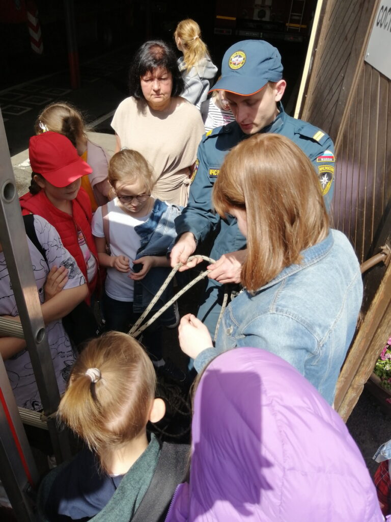 Началась экскурсия с изучения пожарного автомобиля и многочисленных вопросов детей. Также на экскурсии детям провели мастер-класс по вязке пожарного узла. Все дети повторили узел, который показывал пожарный. Далее ребят познакомили с боевой одеждой пожарного и оборудованием, которым пользуются сотрудники пожарной части. Интересная экскурсия закончилась просмотром работы пожарной автолестницы.