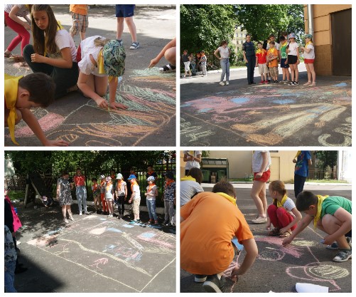Пока одни проходили эстафету, другие рисовали на асфальте. Важными условия этапа стали: на рисунке обязательно должны присутствовать пожарный автомобиль, пожарный-спасатель и место расположения пожара на выбор (лес, квартира, дом). Каждый отряд хорошо справился с данной задачей и нарисовал достойные рисунки.