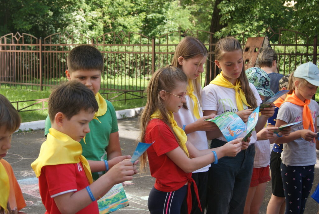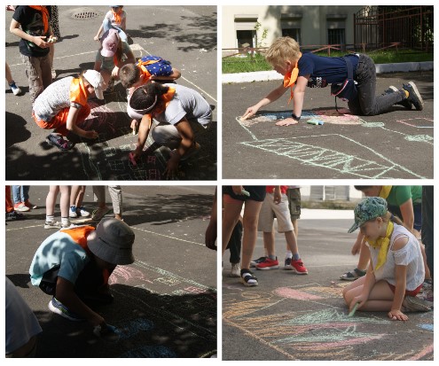 В лагере находится 2 отряда, поэтому было принято решение, один отряд отправить на этап «Рисунок на асфальте», а второй – на «Пожарная эстафета».