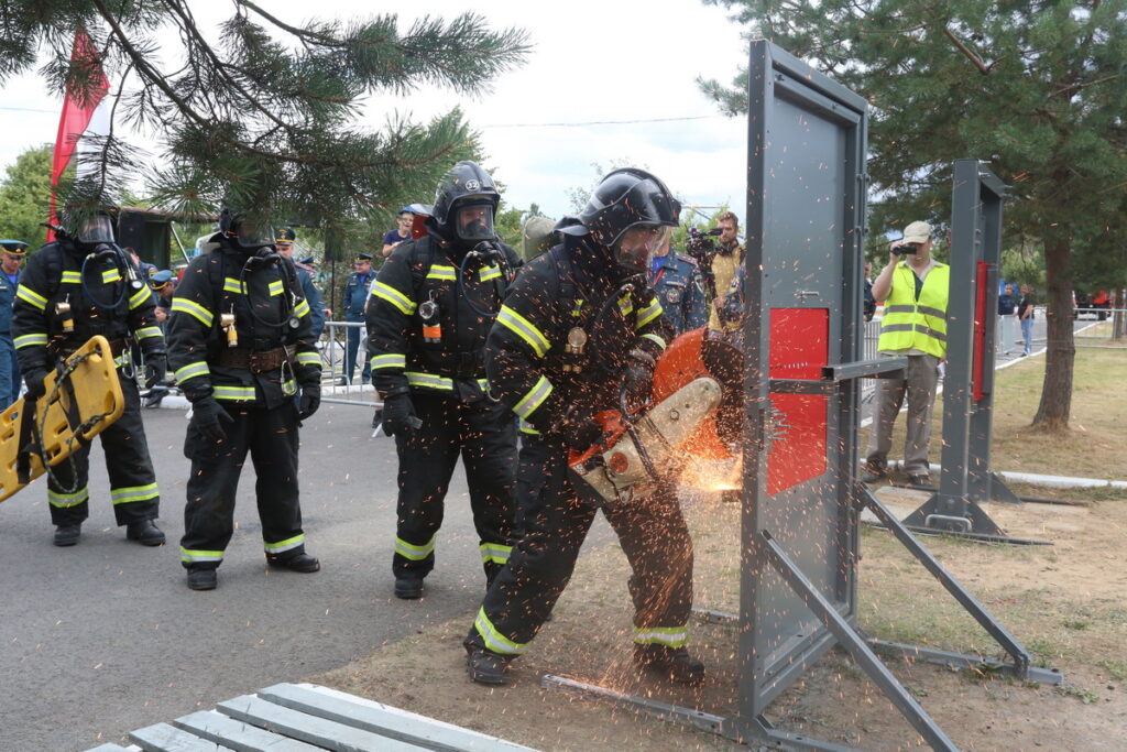 Второй этап включал два практических задания, которые проходили на учебно-тренировочном полигоне МЧС – экипированные боевой одеждой и снаряжением участники, преодолев огневую полосу, должны были вскрыть дверной проем и ликвидировать утечку жидкости, а затем, отыскав условных пострадавших, спасти их, оказав одному из них первую медицинскую помощь.