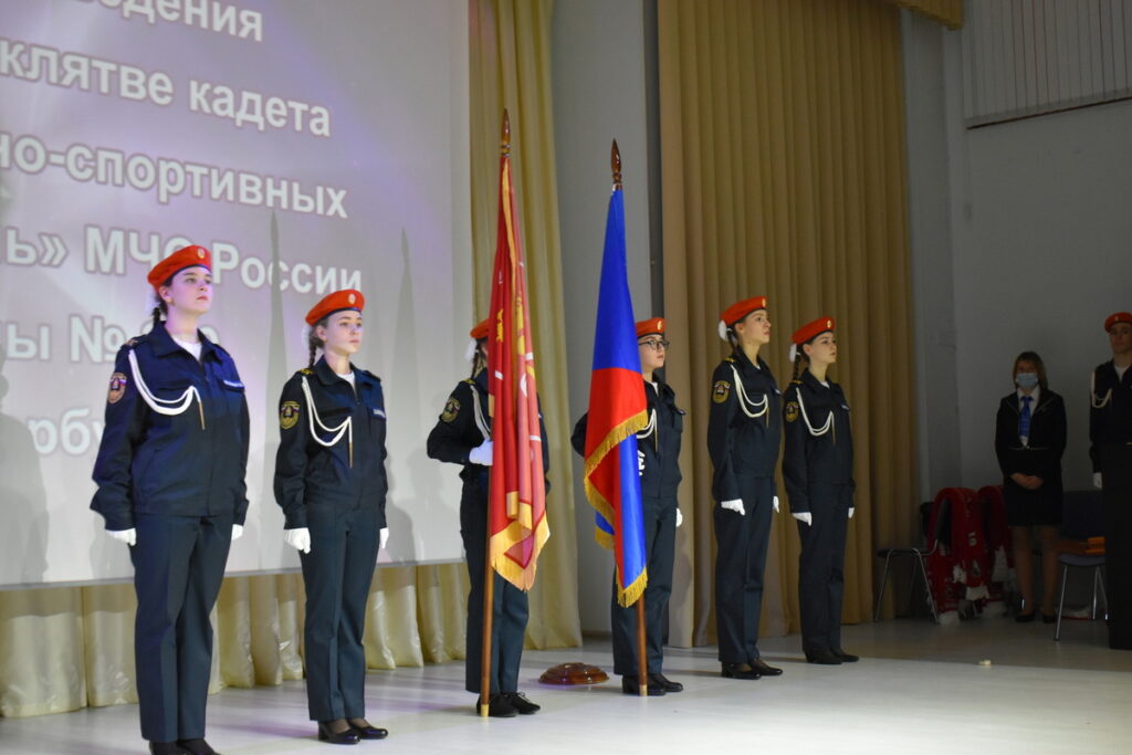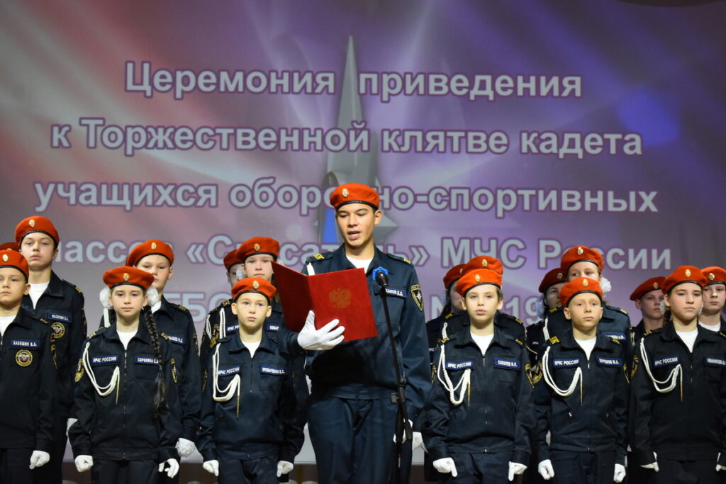 50 учащихся спортивно-оборонных классов «Спасатель» произнесли клятву и пообещали достойно нести звание кадета МЧС России.