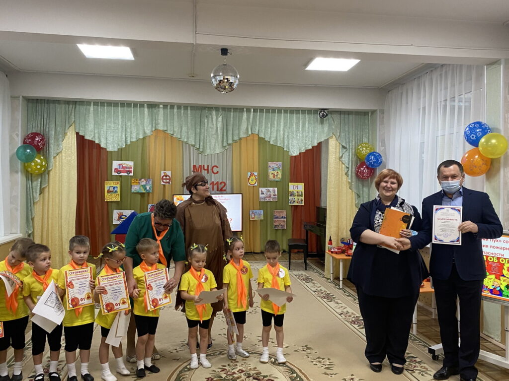 От СПб ГО ВДПО, заведующей детским садом Бороновой О. В., вручили детские костюмы пожарного.