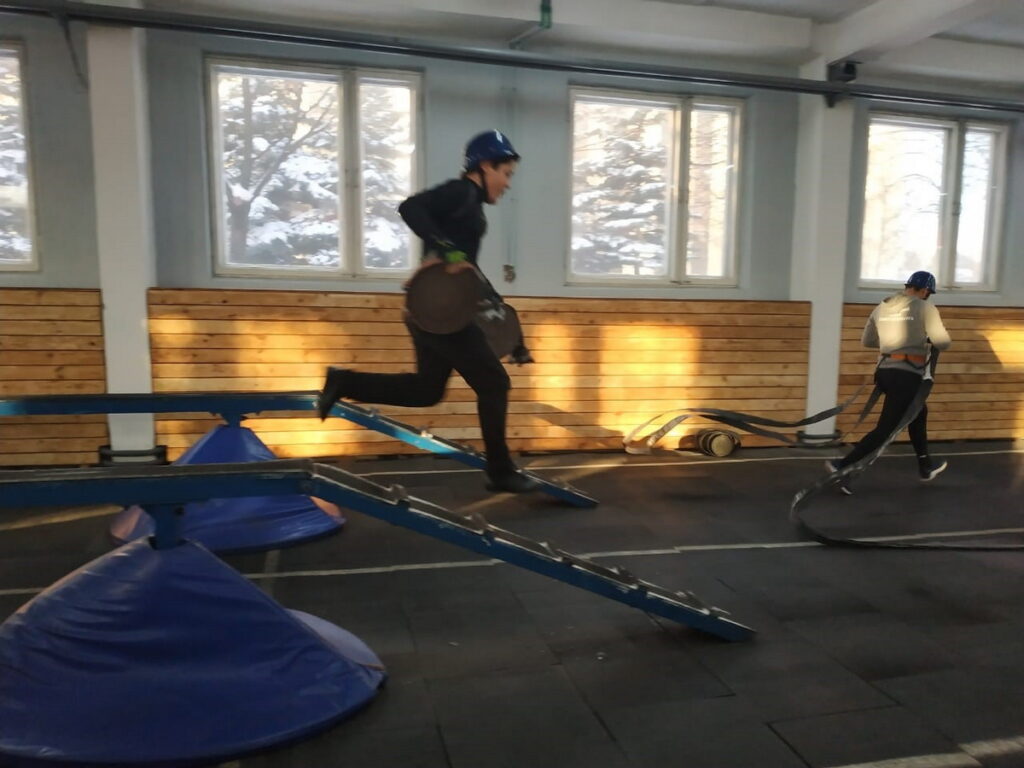 Состязались команды по двум видам спорта: преодоление 100-метровой полосы с препятствиями и подъем по штурмовой лестнице в окно второго этажа учебной башни.