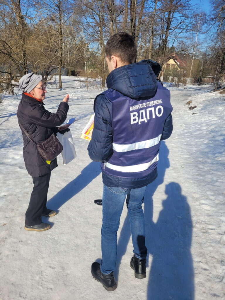 Также на постоянной основе, совместно с представителями Выборгского отделения СПБ ГО Всероссийского добровольного пожарного общества, проводится работа с населением по профилактике пожаров. Инспекторы Госпожнадзора и сотрудники ВДПО разъясняют жителям правила противопожарного режима в Российской Федерации, и вручают памятки по пожарной безопасности и действиям при обнаружении пожара. В ходе рейда сотрудники МЧС и ВДПО провели беседу с местными жителями, напомнили о важности соблюдения пожарной безопасности, обратив особое внимание на вопросы, связанные с растопкой печей, использования электрических обогревателей и газового оборудования.
