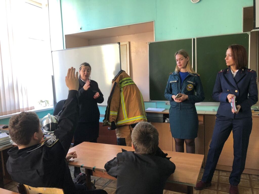 Сотрудники отдела надзорной деятельности и профилактической работы Московского района управления по Московскому району Главного управления МЧС России по г. Санкт-Петербургу совместно с представителями Московского отделения ВДПО и представителями СПб ГКУ «Пожарно-спасательный отряд противопожарной службы по Московскому району» подробно разобрали с учениками алгоритм действий на случай пожара – что делать в первую очередь, как связываться с экстренными службами и что им сообщать, чтобы как можно быстрее получить помощь.