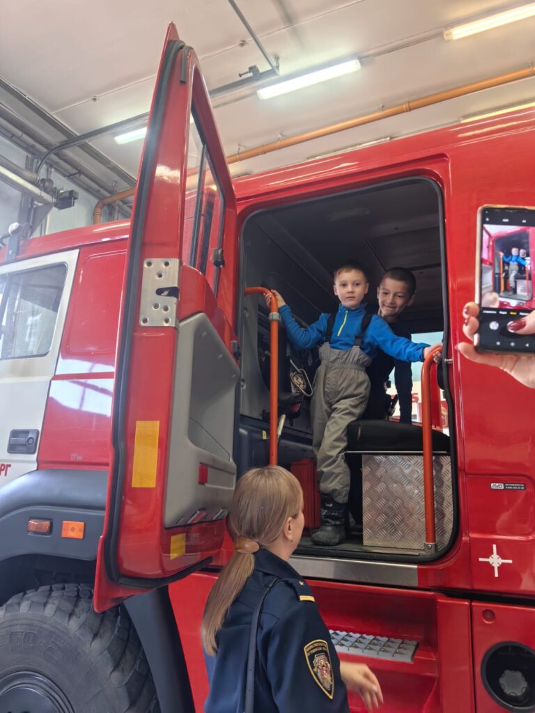 Экскурсия началась с демонстрации оснащения пожарного автомобиля. Пожарные показали школьникам предметы боевой одежды и рассказали, что она служит для защиты от воды, высокой температуры и получения травм при тушении пожаров. Ребята узнали, что вес пожарного снаряжения около 30 кг, смогли увидеть, как используется дыхательный аппарат и даже, как работает пожарный. По окончании экскурсии мальчишкам и девчонкам довелось посидеть в кабине настоящего пожарного автомобиля и всё как следует рассмотреть.
