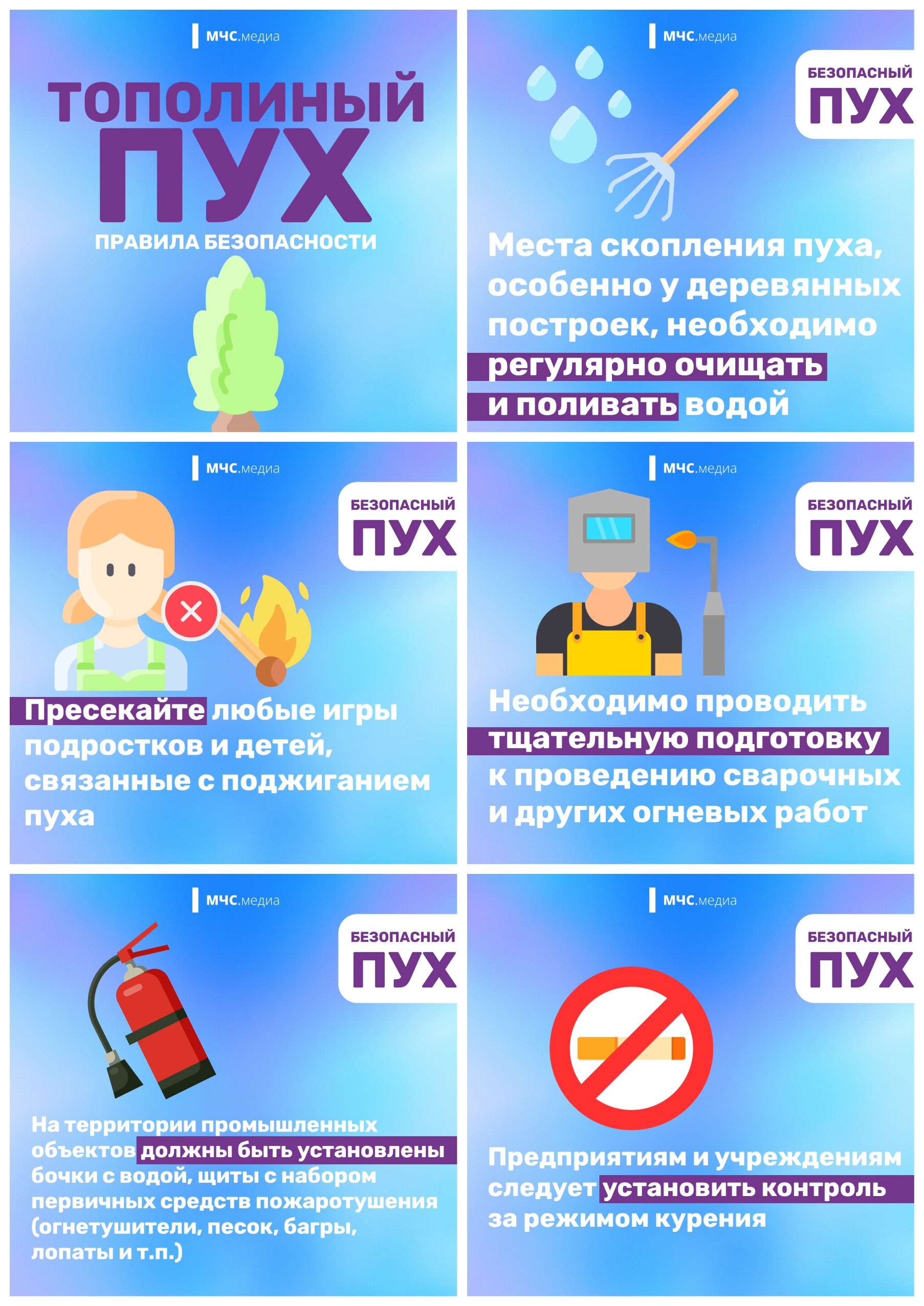 По свойствам тополиный пух сравнивают с порохом, поскольку легко воспламеняется и горит с большой скоростью – огонь может легко перекинуться на жилые дома, общественные здания, постройки. Наибольшей опасности возгорания подвержены деревянные строения, а также гаражи и стоянки автомобильного транспорта.