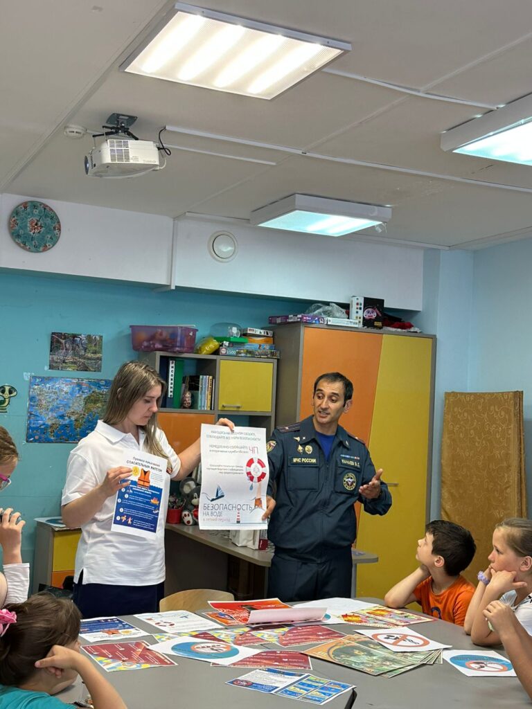 Детям подробно объяснили правила безопасности на воде и при пожаре.  Им рассказали, что купаться можно только в специально оборудованных местах, и никогда нельзя приближаться к водоёмам без присмотра взрослых.  Кроме того, в увлекательной форме им объяснили, как предотвратить возникновение пожаров, и что нужно делать, если пожар всё-таки произошёл.  Обучение включало в себя конкретные и понятные инструкции по действиям в обеих ситуациях – на воде и при пожаре.