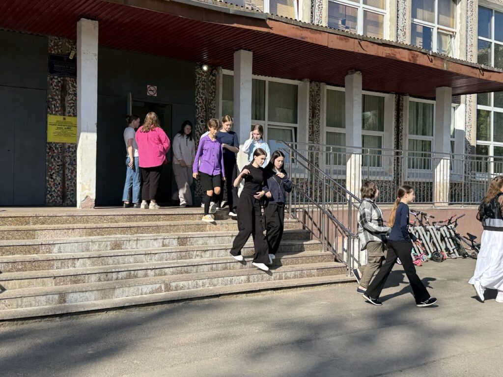По сигналу тревоги все классы организованно, без паники и суеты, покинули учебные кабинеты и здание школы через эвакуационные выходы.