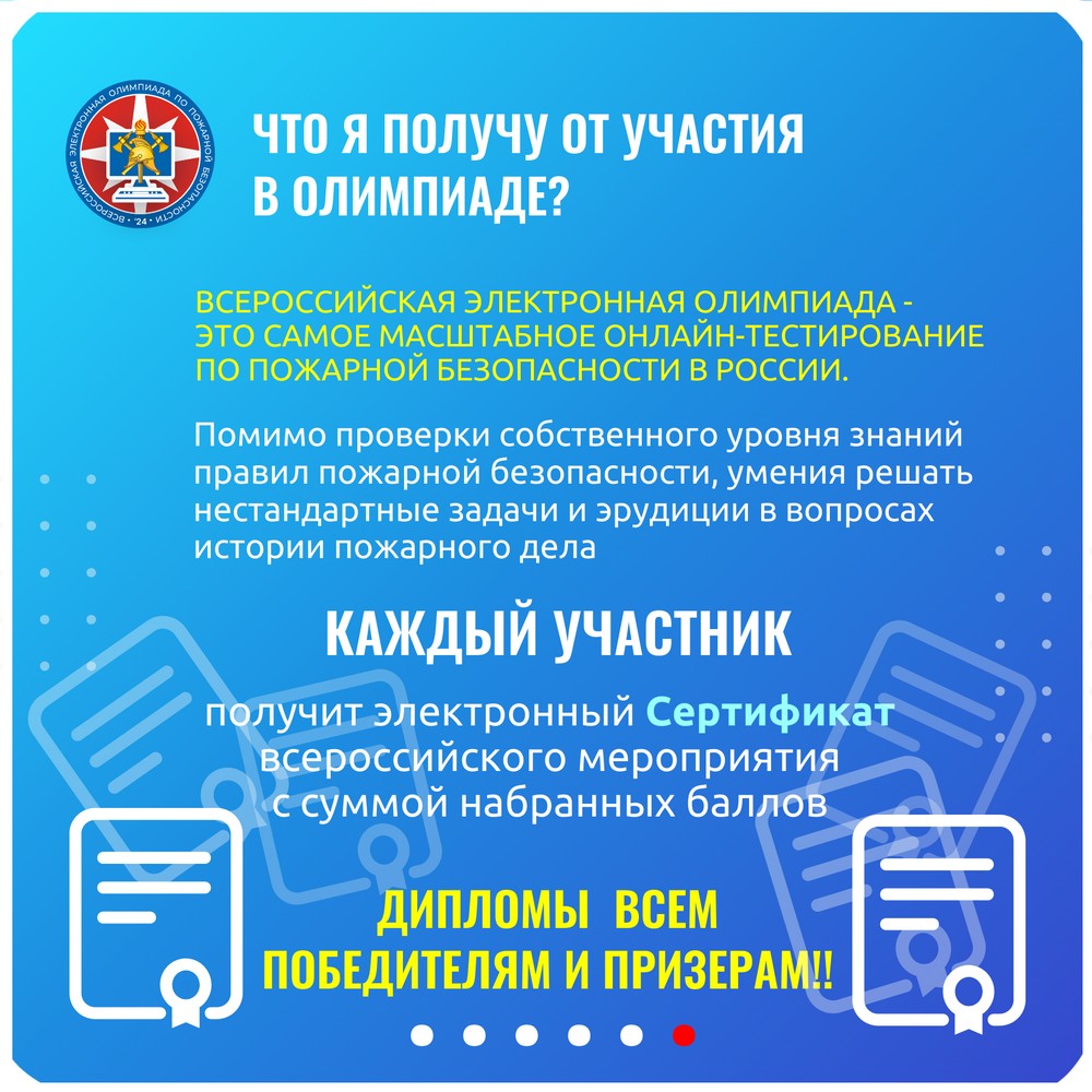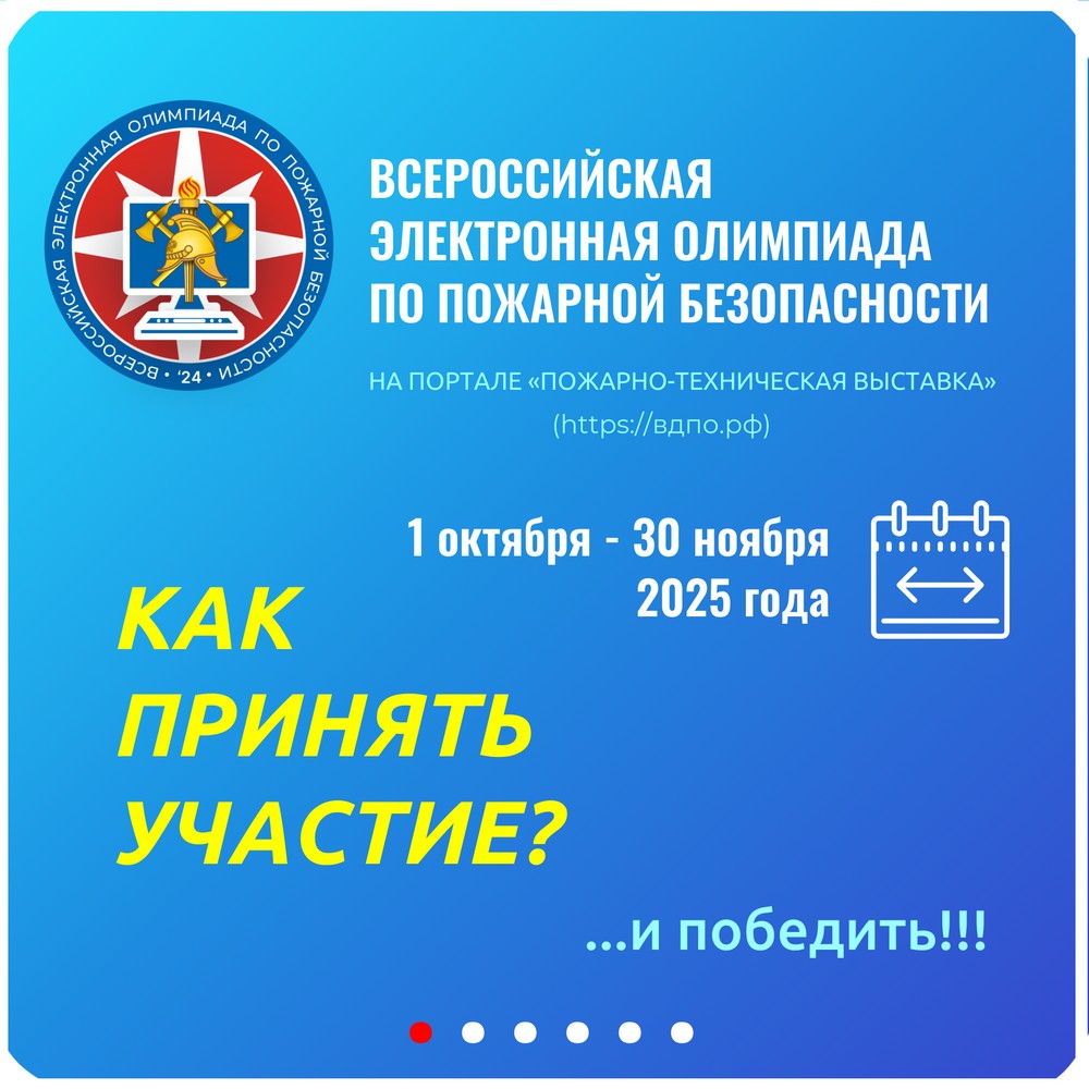 1 октября 2025 года на федеральном информационном обучающем портале «Пожарно-техническая выставка» вдпо.рф стартует ежегодная Всероссийская электронная олимпиада по пожарной безопасности (далее – Олимпиада). Это самое масштабное тестирование знаний детей и подростков по темам истории пожарной охраны и пожарного добровольчества в России, профилактики пожаров и возгораний, знаков эвакуации и пожарной безопасности, действий в случае возгораний и пожара, а также профессиональной ориентации.