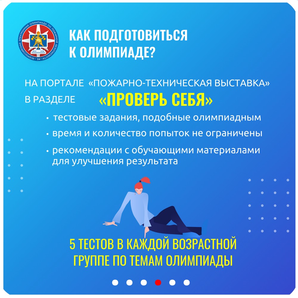 Чтобы результат принёс удовлетворение и высокие баллы, к тестированию лучше подготовиться заранее. Это можно сделать на портале «Пожарно-техническая выставка» вдпо.рф в разделе: «Проверь себя», выбрав тему и возраст. Тесты созданы на основе вопросов, подобных тем, что встретятся в Олимпиаде. По окончании тестирования портал предложит участнику дополнительные обучающие материалы по выбранной теме, чтобы улучшить результат.