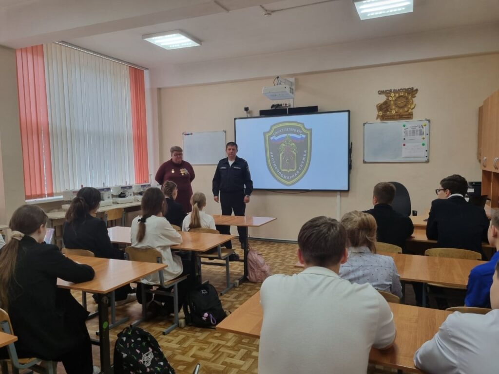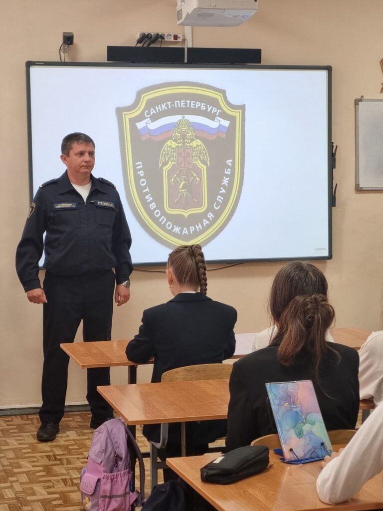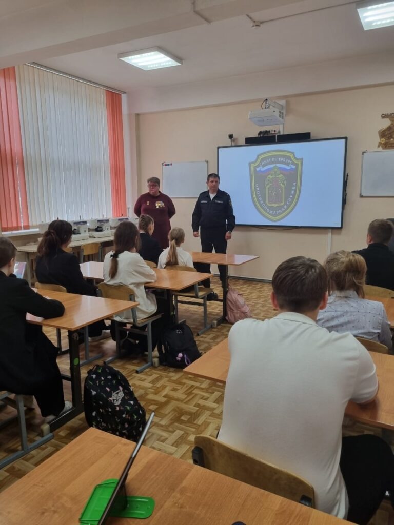 Ученики 7 Г класса 461 школы пригласили в гости представителей пожарно-спасательного отряда и местного отделения ВДПО. Чтобы от профессионалов услышать о профессии пожарного-спасателя. Мехоношина Л. Л. и Стативо А. С. рассказали ребятам, чем занимаются пожарные. Что должны знать при тушении пожара. Мехоношина Л.Л. рассказала ребятам о своей службе в рядах МЧС, а так же напомнила ученикам правила пожарной безопасности. Стативо А. С. проинформировал о требованиях, условиях поступления и возможностях обучения в Санкт-Петербургском университете ГПС МЧС России, а также Пожарно-спасательном колледже Северной столицы. Ученики задавали гостям интересующие вопросы и получали исчерпывающие ответы. По окончанию мероприятия, традиционно, сделали общее фото с гостями.