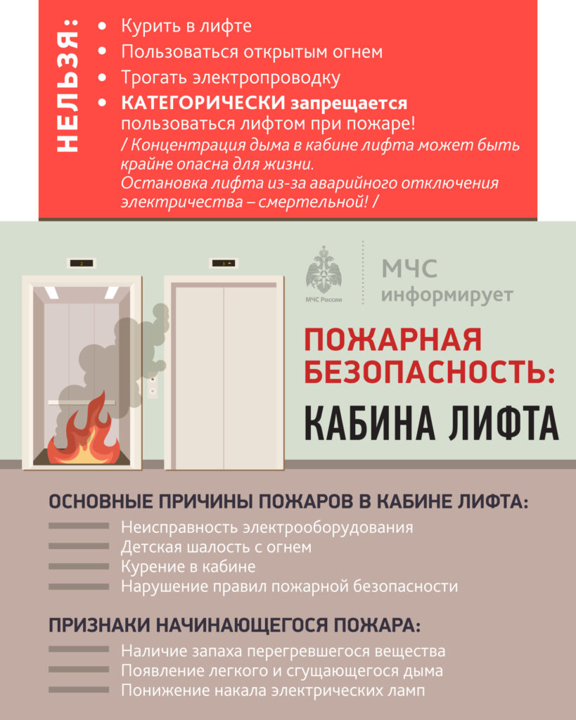 Запомните одно главное правило: в любой аварийной ситуации (пожар, землетрясение, потоп, запах гари или сильного дыма) пользоваться лифтом ЗАПРЕЩЕНО.