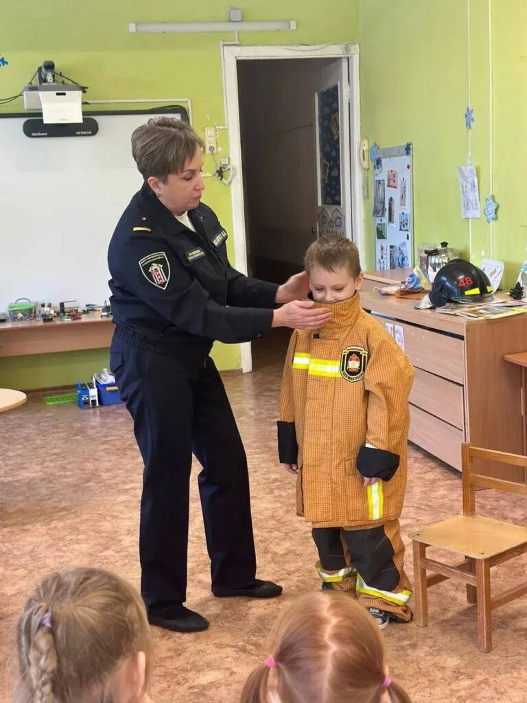 Детям напомнили правила пожарной безопасности. Закрепили навыки действий в случае возникновения пожара. Рассказали ребятам о службе в пожарной охране. Малыши с удовольствием примерили боевую одежду пожарного.