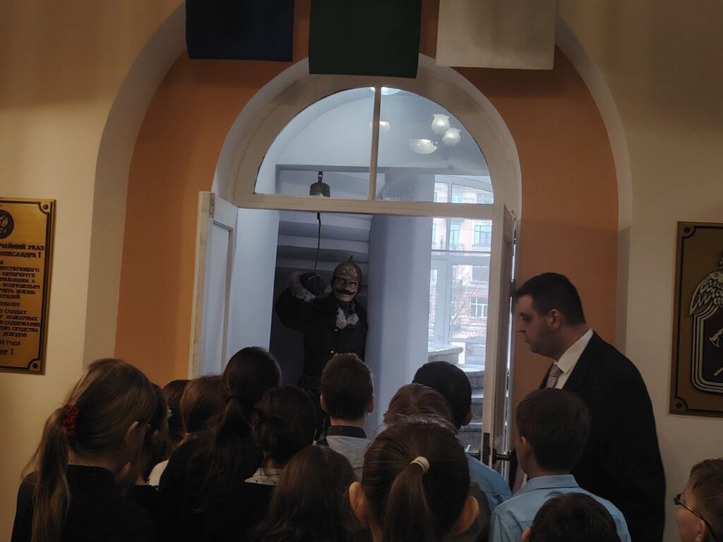 Далее экскурсия продолжилась в зале, который посвящен каланчевой службе. Детям очень запомнился интерактивный показ работы часового. С большим интересом и восторгом гости посетили залы с пожарными автомобилями и даже смогли посидеть на одном из них.