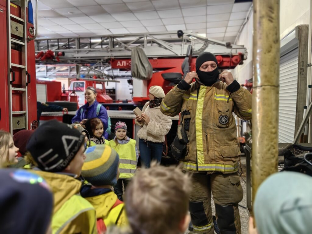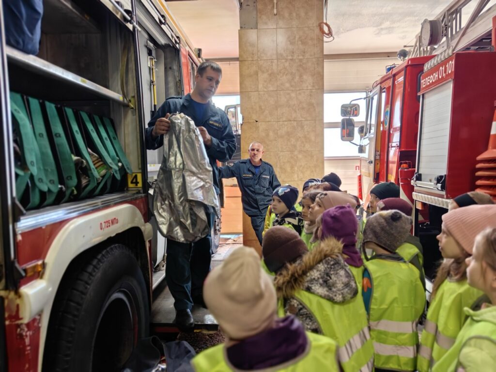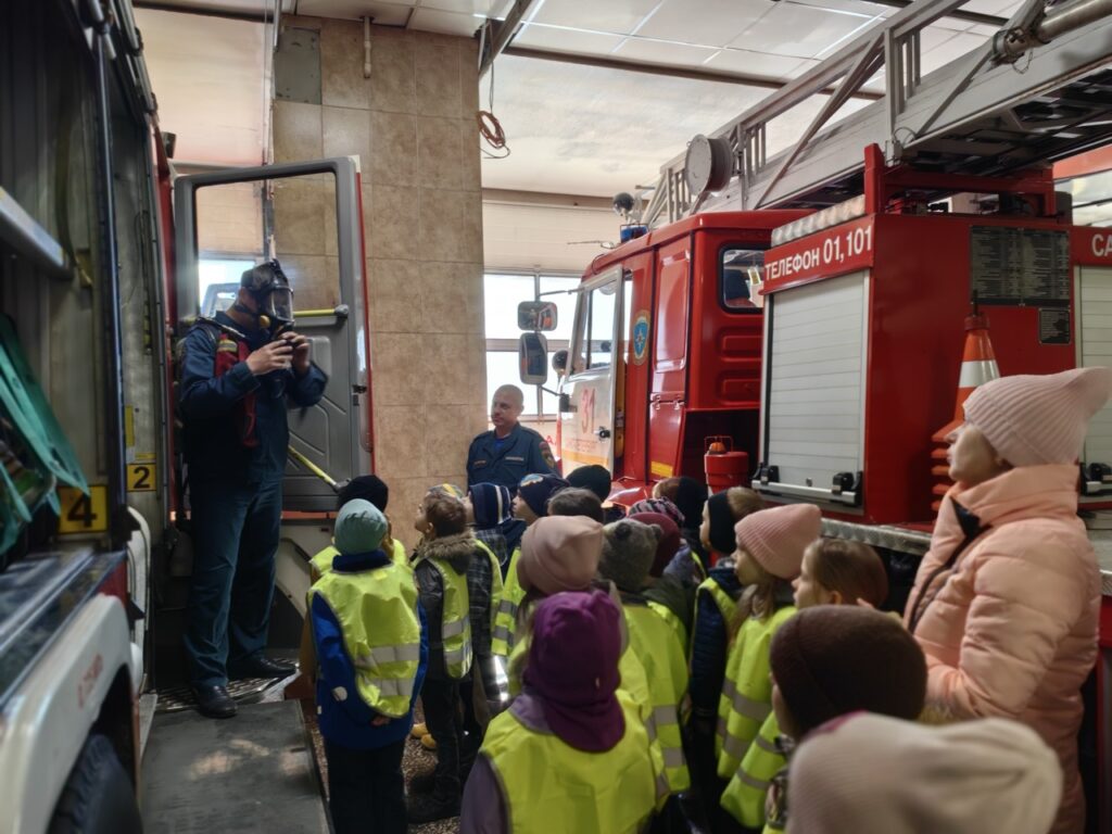 Первым делом юные гости с большим интересом изучали оснащение пожарного автомобиля. Каждый ребёнок смог подняться в кабину и почувствовать себя настоящим пожарным. Затем сотрудник части Мирошник И. С. наглядно продемонстрировал боевую экипировку огнеборцев, подробно рассказал о работе при тушении пожаров и о том, как важно действовать слаженно и быстро.